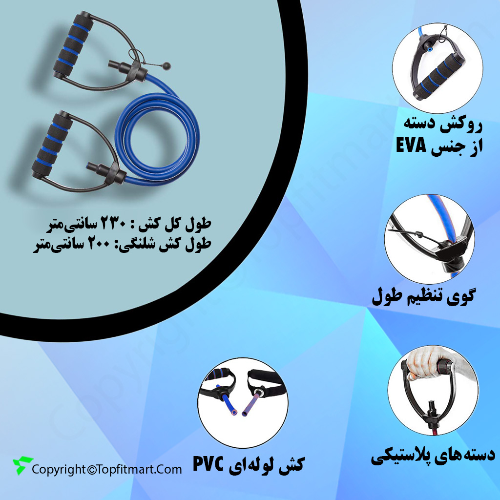 طول کش لوله ای یا شلنگی در حدود 200 سانتی متر بوده و دسته های پلاستیکی طولی در حدود 15 سانتی متر دارند که در مجموع طول کل آن در حدود 230 سانتی متر است. - تک مقاومت
